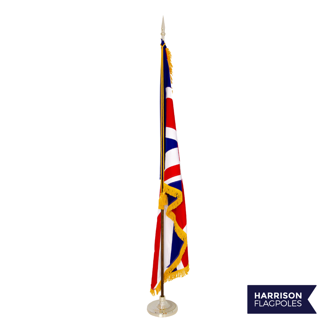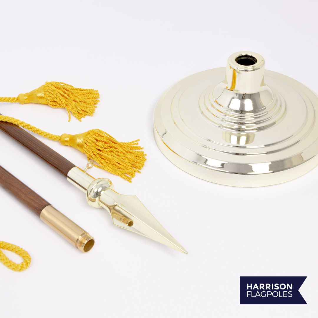 The 8ft (2.4m) highly polished oak finish 2 piece pole comes complete with gold finish base and spear top to hold your chosen flag.